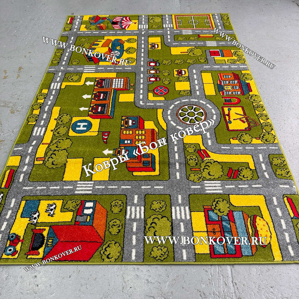 Напольные покрытия для детской комнаты - это всегда яркие цвета, интересные рисунки. Дизайн новинки станет отличным решением для оформления комнаты, где живет ваш малыш. Полотно ковра украшает яркий и занимательный рисунок. Использование износостойких материалов позволило создать Детский Ковер Город 02 Зеленый с мягким, приятным при ходьбе ворсом, который обладает антистатическими и гипоаллергенными свойствами.
